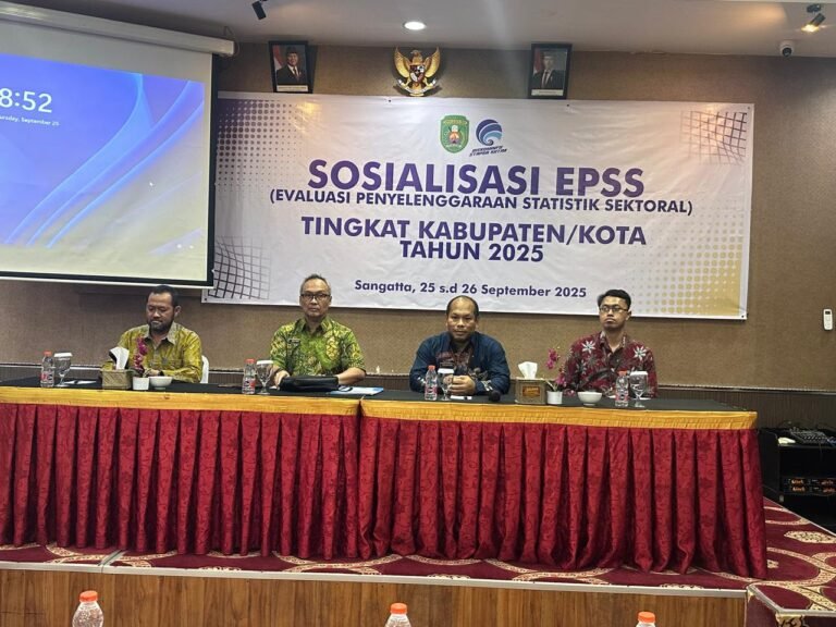 SANGATTA – Upaya meningkatkan kualitas data sektoral terus dilakukan Pemerintah Kabupaten Kutai Timur (Kutim). Melalui Dinas Komunikasi, Informatika, Persandian dan Statistik (Kominfo Staper), digelar Sosialisasi Evaluasi Penyelenggaraan Statistik Sektoral (EPSS) di Hotel Royal Victoria, Kamis (25/9/2025). Kegiatan ini menghadirkan narasumber dari Badan Pusat Statistik (BPS) Kutim serta diikuti 30 Organisasi Perangkat Daerah (OPD).
